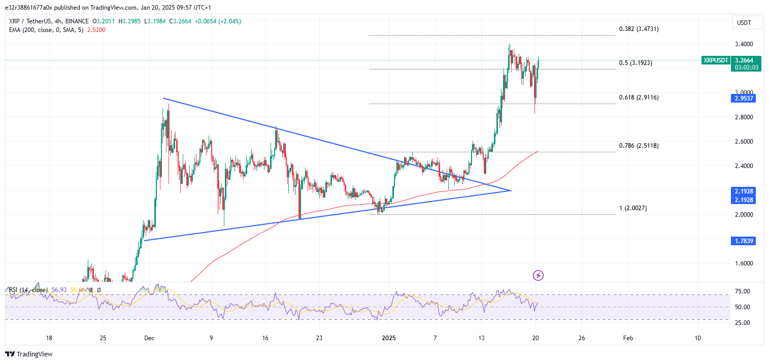 The Fibonacci retracement tool shows that XRP is at risk of becoming bearish if it breaks below the $2.9 price level, where it might fall further down to the $2.5 zone.